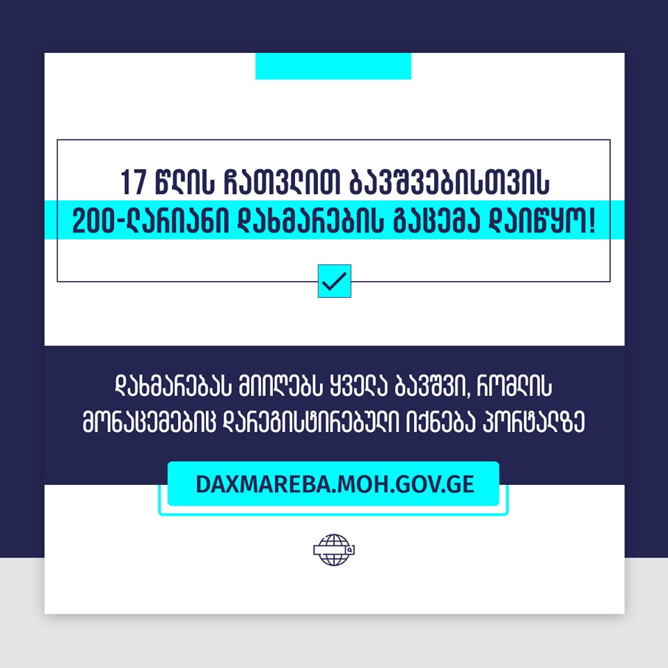17 წლის ჩათვლით ბავშვებისთვის 200-ლარიანი დახმარების ეტაპობრივი ჩარიცხვა დაიწყო