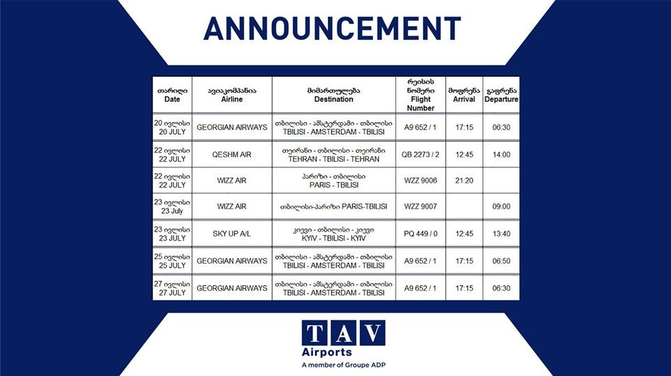 20-27 ივლისის ფრენების განახლებული განრიგი გამოქვეყნდა