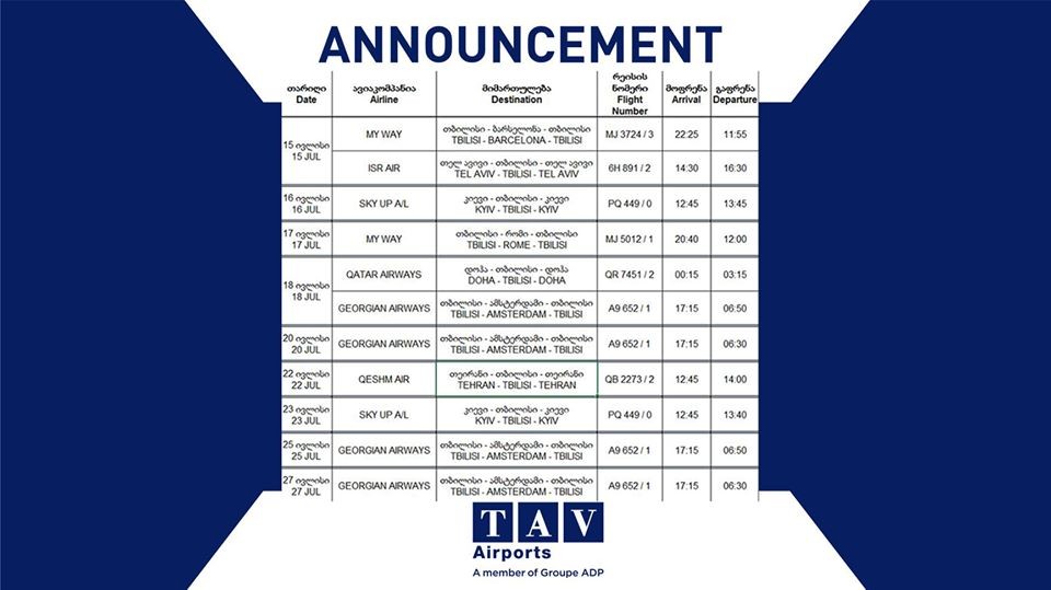 15-27 ივლისის ფრენების განახლებული განრიგი გამოქვეყნდა